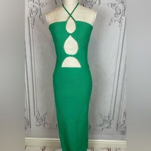 This unforgettable Emeral Bay Midi dress showcasing sultry cutouts along the front and back, a halter neck, and a bodycon silhouette on a knit fabric with a plenty of stretch to show of your curves.