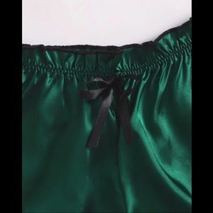 This emerald & black, bandeau lace and satin, lingerie set is unlined with a sheer, slightly stretchy, laced brallete and cheeky, silky bottoms. The bust of the top is unpadded and slights right on. The bottoms are a high-rise, contrast fabric with an elastic waistband. The material is 65% polyester and 35% nylon. The size description is disclosed in the photo above.