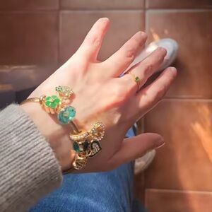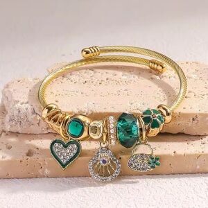 This stunning charm bracelet features a blend of gold and green tones, perfect for adding a touch of elegance to any outfit. The intricate charms and vibrant colors make it a standout piece in any jewelry collection.