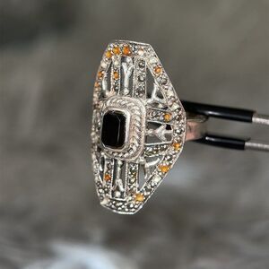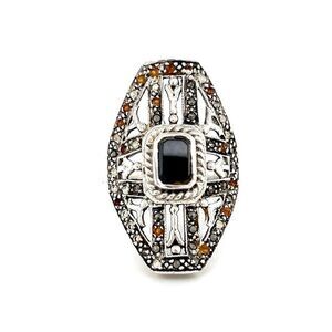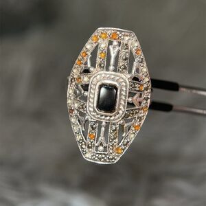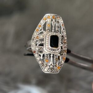 Emerald Cut Onyx / Marcasites (Missing Few) Sterling Silver 925 Ring
