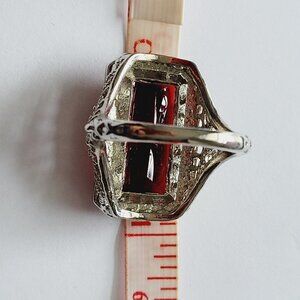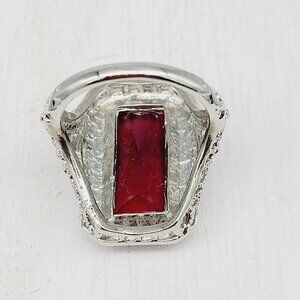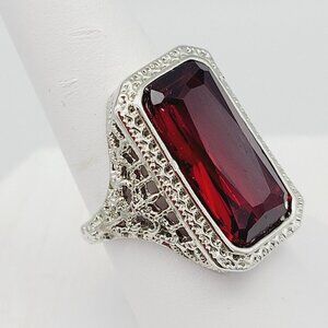 Emerald Cut Red Glass Filigree Ring Sz 7.75 Vintage New Old Stock Silver Tone