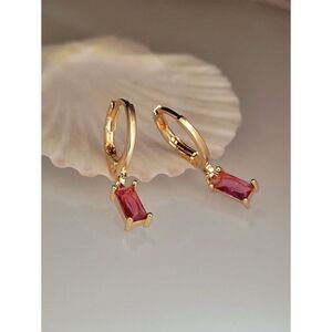 Emerald Cut Ruby Red Glass Earrings Dangle Drop Goldtone Hoop Delicate Feminine