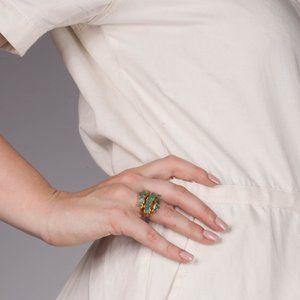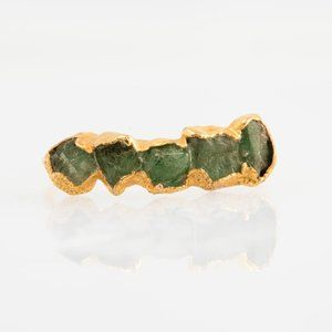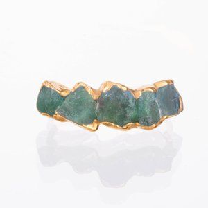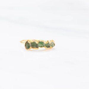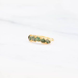 A raw emerald eternity ring with a comfortable dainty ring shank. To maximize comfort, this ring is designed as a half eternity band, with gemstones only visible on the top half of the ring. Each ring will have 5 genuine raw emeralds, and may vary slightly in size and length across the ring band. Smaller sizes the emeralds may encompass half or more of the entire ring shank, and larger sizes they may only encompass 1/3 or less of the ring. The model above is wearing a size 7. This ring stacks well with our gold dotted ring. Consider buying two or more of these emerald eternity rings and stack up for a bold statement. Emeralds are the birthstone for May! 5 Natural, uncut emeraldsGem size 35mm14k Gold Filled Shank24k Gold DippedThis ring pairs well with my emerald earrings <a href="https://www.etsy.com/listing/486140604/rawemeraldearringsemeraldgoldstud" target="_blank">https://www.etsy.com/listing/486140604/rawemeraldearringgreenemerald</a>You will receive one of the rings pictured above, or a ring nearly identical to the rings above. Since each gemstone is oneofakind, I cannot guarantee that the gemstone you see above will be on a ring shank in your size. I have tried my best to photograph the varying degree of colors, so your ring will fall in the spectrum of color among the rings photographed above.