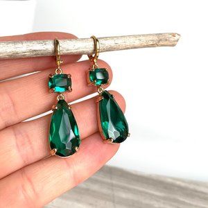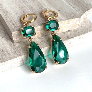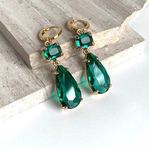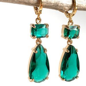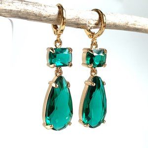 Emerald Glass double drop prong set stone Earrings ~NWT