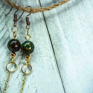 Elevate your style with our emerald green agate bead dangle earrings. These earrings feature a sleek gold chain and a decorative loop in front of the bead, blending elegance with modern design. Perfect for any occasion, they add a touch of sophistication and vibrant color to your ensemble.