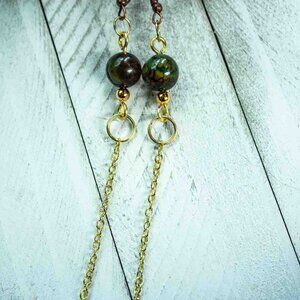 Emerald Green Agate Bead Dangle Earrings with Gold Chain