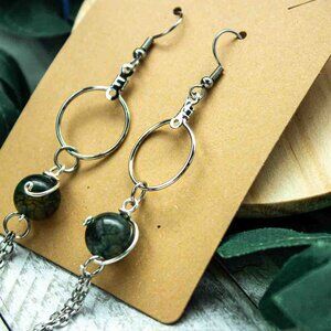 Enhance your style with our emerald green agate bead dangle earrings. Featuring a sleek stainless steel chain and a decorative loop in front of the bead, these earrings blend elegance and modern design. Perfect for any occasion, they add a touch of sophistication and vibrant color to your ensemble.