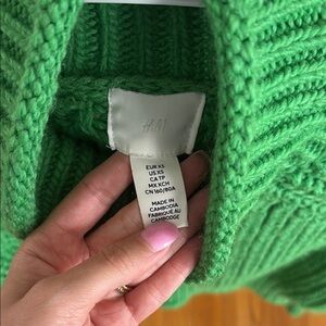This vibrant emerald green sweater features a cozy cowl neck and a chunky ribbed knit pattern. Its cropped length and fitted design make it a stylish choice for cooler days.