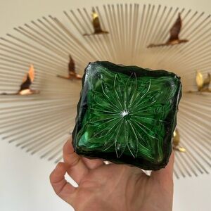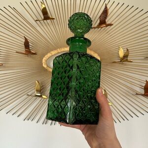 Add a touch of elegance to your home with this stunning emerald green glass decanter. Perfect for displaying or serving your favorite beverages.