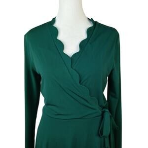 Emerald Green Faux Wrap Dress Scalloped Neckline Longsleeve Formal Modest