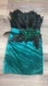 Stunning emerald green satin cocktail dress with feather and jewel embellishments. Perfect for special occasions.