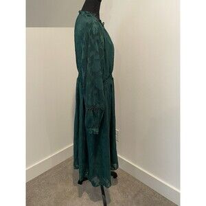 Keywords: emerald green dress, floral midi dress, long sleeve dress, smocked waist dress, burnout dress, bohemian dress, boho dress, party dress, wedding guest dress, evening dress, ruffled collar dress, v-neck dress, midi dress