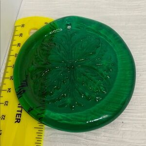 Beautiful green glass paperweight suncatcher or pendant drilled featuring a lovely flower. Perfect for adding a touch of elegance to any desk or shelf or self and it may be an unsigned Benko in research. Sold unknown designer as photographed. So pretty!