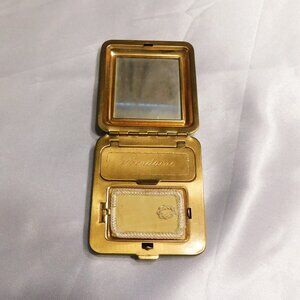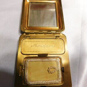 Inside is an OK mirror, not perfect, but viewable. It has a door on the top that does not have a latch that houses a lipstick, marked Raspberry, and a small rouge with puff that is also marked Raspberry. The puff is clean, and the cosmetics mentioned are still covered.