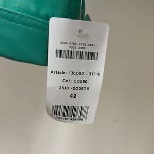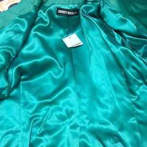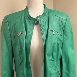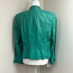 This striking emerald green leather jacket features a sleek, collarless design and a fitted, structured cut. Its smooth, polished finish enhances the bold color, making it a standout piece in any wardrobe.