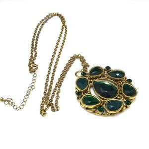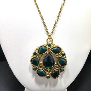 This is a great vintage pendant necklace with emerald green rhinestones on the pendant. The pendant is 2 1/2 Inches in length and 2 1/8 Inches in width. The rustic antique gold tone chain is approximately 34 inches with a lobster clasp. There is a larger bail so I believe the long chain may have been added later to the vintage pendant. Pre-owned.