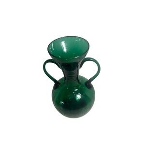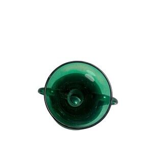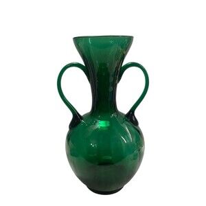 This emerald green ribbed glass vase is a stunning piece of art deco style decor, hand-blown with handles adding a unique touch to its design. Standing at 8 inches tall, this unmarked vase is a perfect addition to any room looking to add a pop of color and elegance. Made of high-quality glass, this artisan piece showcases the beauty of art glass production techniques, making it a true statement piece for any collector or decorator.