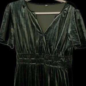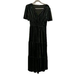 Stunning emerald green velvet maxi dress featuring a soft, luxurious texture and a flattering tiered silhouette. The elastic waistband defines your shape while keeping it comfortable, and the short flutter sleeves and V-neckline add an elegant touch. Perfect for holiday parties, weddings, or date nights — this dress is both timeless and chic.