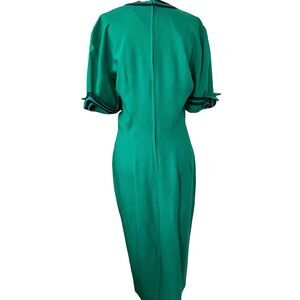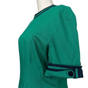 Step into timeless style with this Cynthia Howie for Maggy Boutique vintage 1980s midi dress, a union-made gem. Crafted in emerald green with chic navy trim accents, it features a pleated waist, 1960s inspired mod-style high neckline, and cuffed sleeves with button details for a structured, flattering fit. Perfect for vintage collectors, retro office wear, or special occasions. Pair with heels for elegance or flats for effortless charm.