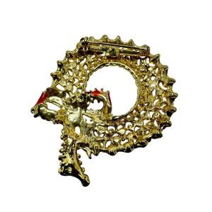 Emerald Green and Cherry Red Enamel, Clear Rhinestone, and Gold Tone Openwork Red Ribbon Bow Holiday Wreath Brooch