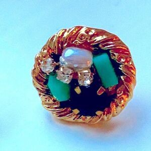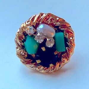TAGS: vintage earrings, emerald crystal studs, turquoise accent jewelry, retro glam earrings, gold-tone statement studs, bridal gift idea, bohemian chic earrings, art deco-inspired earrings, faux pearl accents, unique wedding earrings, designer-inspired studs, modern heirloom style, cocktail party jewelry, bold gold-tone earrings, gemstone sparkle, emerald and turquoise luxe