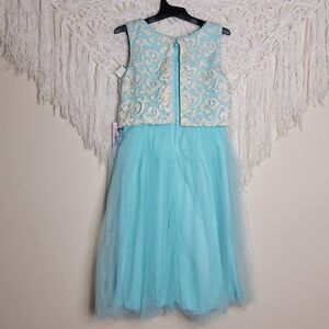 Aqua, Blue, Green, Mesh, Gold, Metallic, Embroidered, Wedding, Party, Summer, Spring, Easter, Party, Event, Special Occasion, Formal, Black Tie, Evening, Zipper back, Lined, Hand Wash inside out, Polyester, Rayon, Nylon,