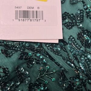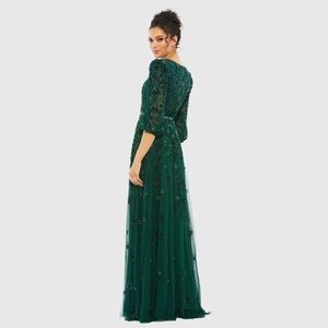 Step into elegance with this emerald long sleeve gown, adorned with exquisite beading. Perfect for making a statement at any formal event.