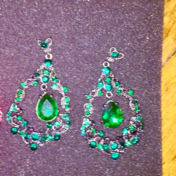These emerald (fancy for green) rhinestone earrings are stunning. Perfect For pageants, homecoming, prom, or formal events.