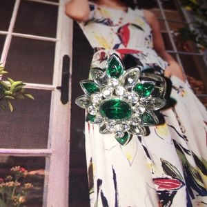 Beautiful flower shaped ring with emerald, light amethyst and diamond colored stones, silver tone band