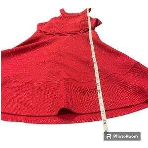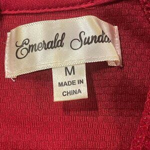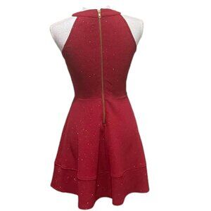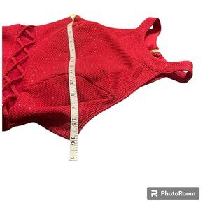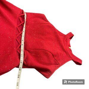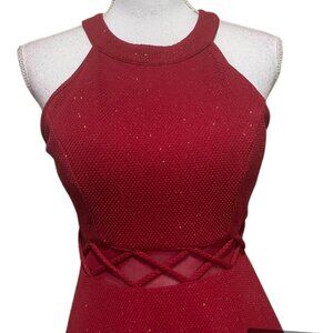 Color is burgundy with weaved sequins throughout and criss-cross design at waist
