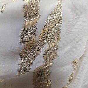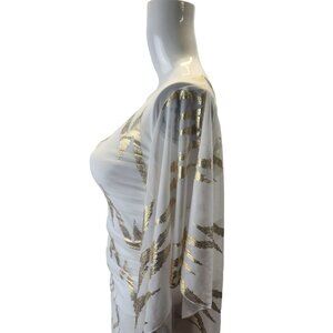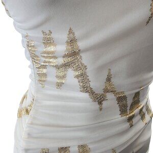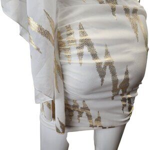 This chic asymmetrical bodycon dress by Emerald Sundae features a gold sequin pattern on white polyester. Perfect for standout style in any setting.