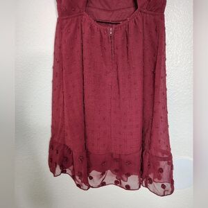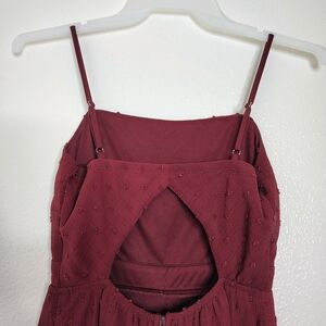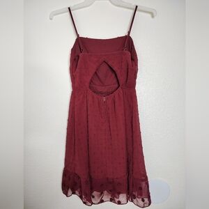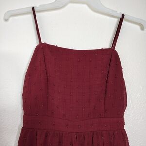Chic burgundy mini dress with adjustable spaghetti straps. Features a textured design and flared hem. back open with waistband elastic, zip closure. Perfect for stylish outings or special occasions.