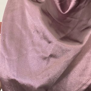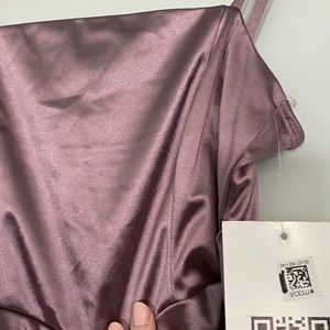 Adjustable spaghetti straps; ruched at side; asymmetric front hem