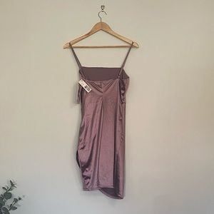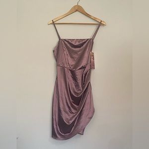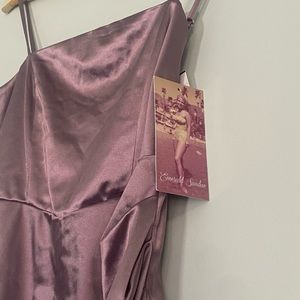 Adjustable spaghetti straps; ruched at side; asymmetric front hem