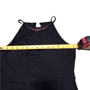Sleeveless mini dress with cleopatra choker decoration. Ruched side, bodice lined and bust padded. back neck button closure. EUC measurements shown.