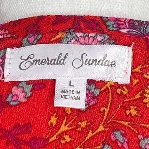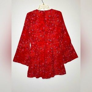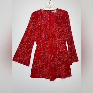 Emerald Sundae red floral romper V neck with zipper back. Bell sleeve - perfect for date night Sz L
