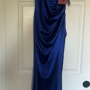 Chic royal blue maxi dress with a sleek design. Features a stylish slit and elegant straps. Perfect for formal events.