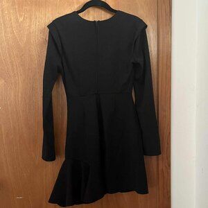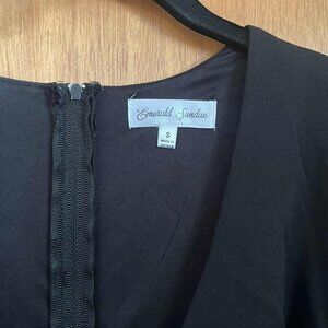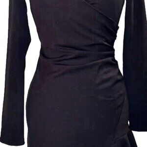 The Emerald Sundae Wrap-Style Ruche Waist V-Neck Ruffle Detail Mini Dress in size Small is a sophisticated and elegant dress perfect for formal occasions like cocktail parties. With a black solid color and long sleeves, this dress features a flattering V-neckline and ruffle accents for added femininity. The zip closure and ruched waist add a touch of sophistication to the short mini length, making it a chic and stylish choice for the seasons of winter, fall, and spring. Designed by Style, this dress embodies a timeless and classic theme that is sure to make a statement at any event.