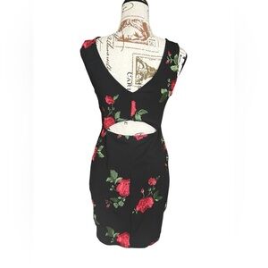 Emerald Sundae black mini dress with side cutouts and embroidered red roses. Sweetheart neckline