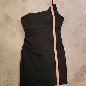 This elegant black one-shoulder dress is perfect for any occasion. Its sleek design and classic color make it a versatile addition to your wardrobe. has stretch ruched sides for slimming look. worn once perfect condition.