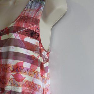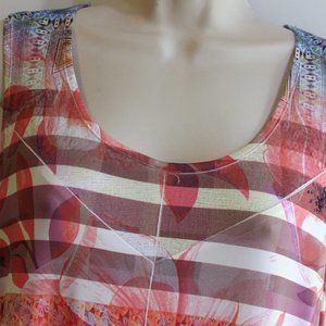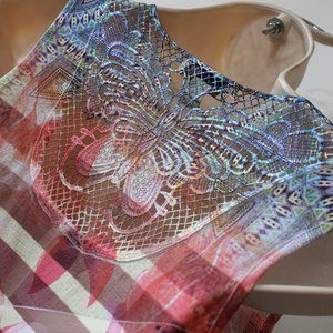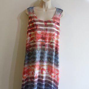 This sleeveless scoop neck maxi dress is so pretty and colorful. It is full length and has a tie dye look with splashy colors of coral, orange, pink, blue, green, yellow and purple. The upper back has an lace-like open weave butterfly. This dress in in like new condition.