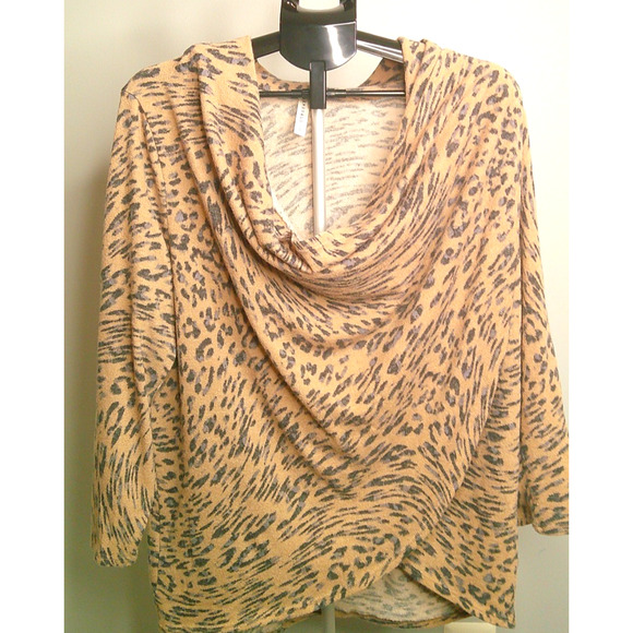 Emerald Women's Cowl Neck Tan Black Animal Print Sweater Wrap Front