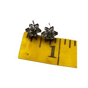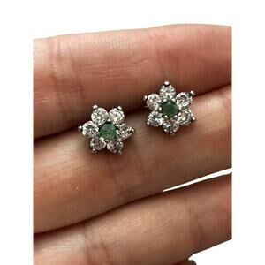 Gorgeous sterling silver earrings with cubic zirconia stones and center stones that appear to be emeralds. They are in excellent condition and tested as sterling. The backs are open to allow light in, which makes the stones shine brightly. The earrings are just smaller than 1/2" in diameter.
