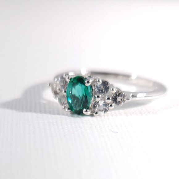 Emerald and White Topaz Ring Sterling Silver Size 6