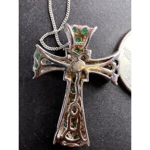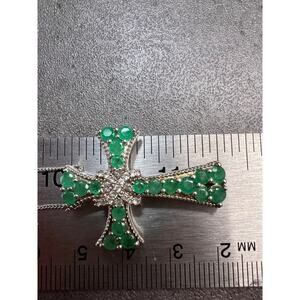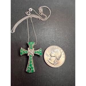 Emerald and zircon sterling silver cross pendant with 20 inch chain