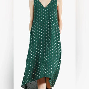 TED BAKER Emerald green with gold accents maxi dress, size 1/US4. Dress is tank style, high/low hemline and is fully lined.