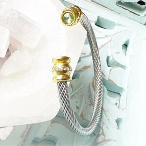 Rhodium in silver and gold multi toned cuff twisted cable bracelet.