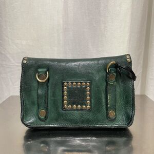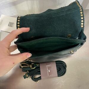 Made in Italy, emerald green leather, comes with cross body strap, care bag, and leather cream