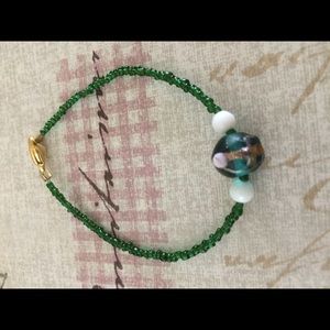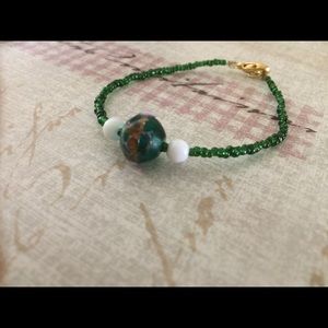 Emerald green seed bead bracelet with emerald green and gold glass bead center. Gold plated lobster claw clasp and white bead accents