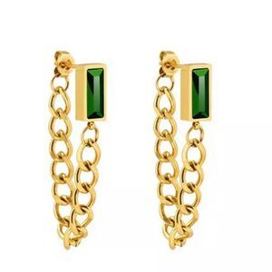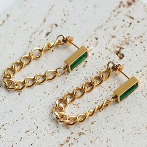 Yellow gold plated pierced emerald cut emerald green stones with chains that connect in the back give these gorgeous earrings a beautiful and stylish look that can be worn casually or for a formal event. Either way you can’t go wrong with these dangling beauties. Lightweight and hypoallergenic these earrings are sure to dress up any outfit. Limited quantities so get yours while they last. Matching necklace sold separately in boutique.